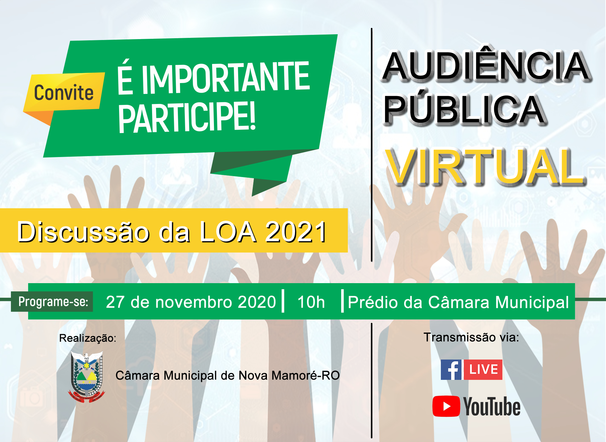 CONVITE SITE, AUDIÊNCIA PÚBLICA VIRTUAL, "LOA"-2021. (AUDIÊNCIA PÚBLICA VIRTUAL, para DISCUSSÃO DO PROJETO DE LEI Nº 048-GP/2020-REFERENTE A "LOA"- 2021)